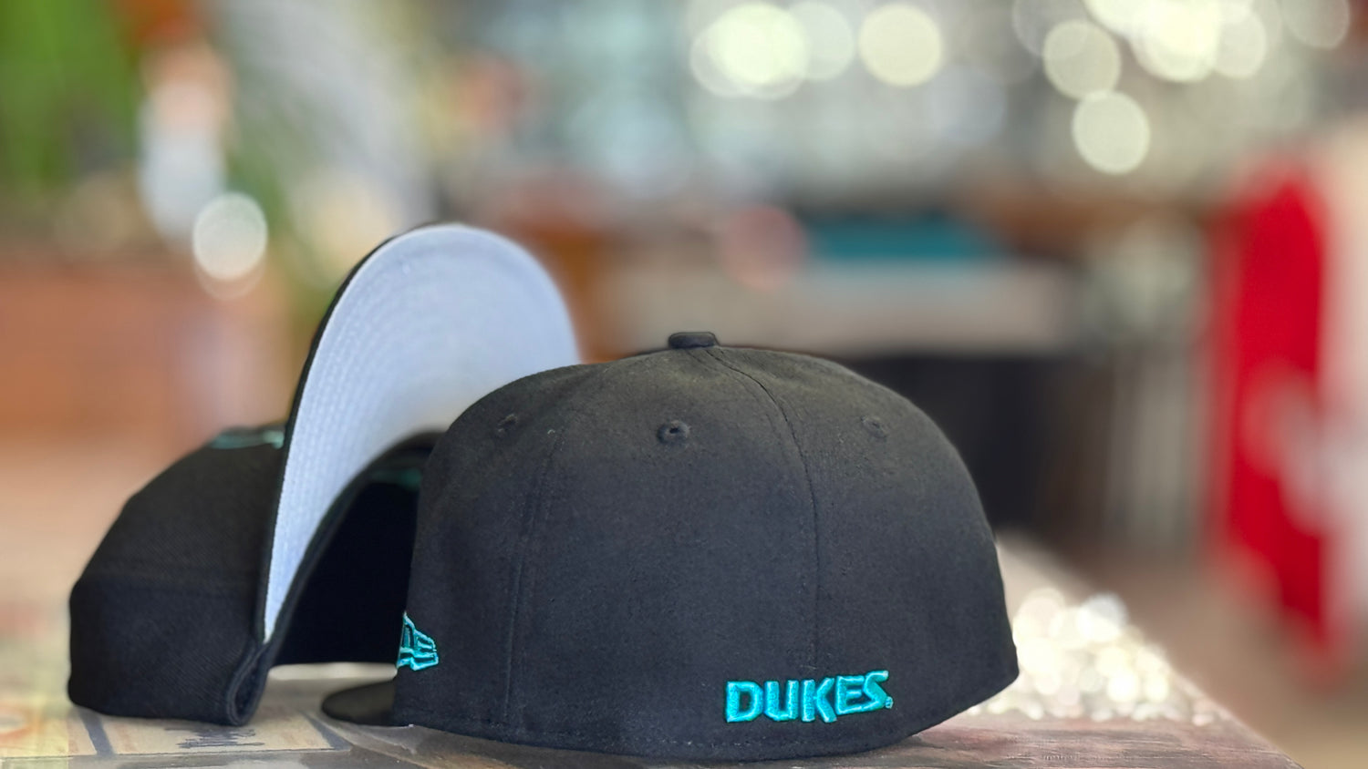 New Era Fitted - Black on Black Dukes logo with Turquoise outline