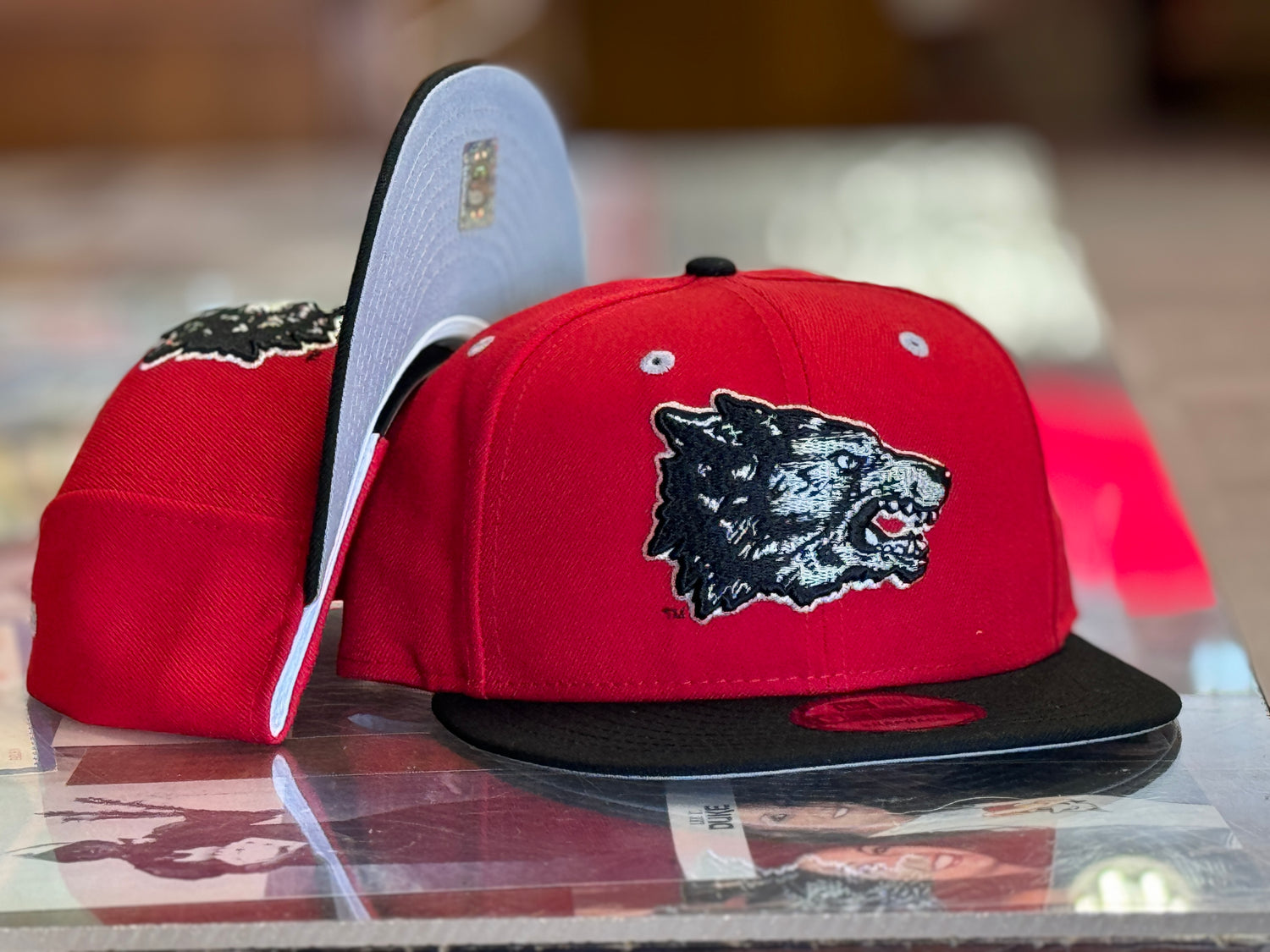 New Era Snapback adjustable hat, Red with 1970's Lobos head logo and Black bill with grau under visor. Silver NEW MEXICO across back!